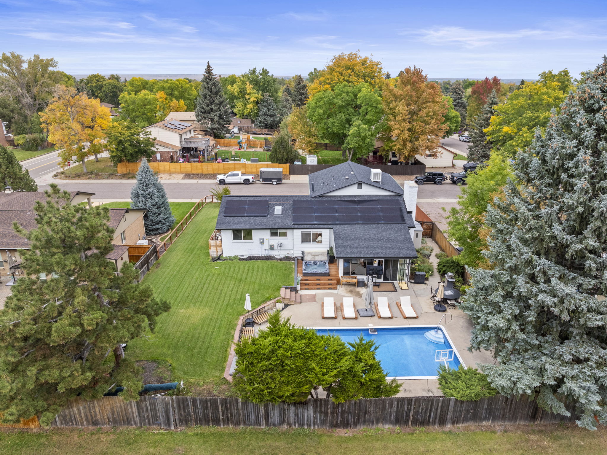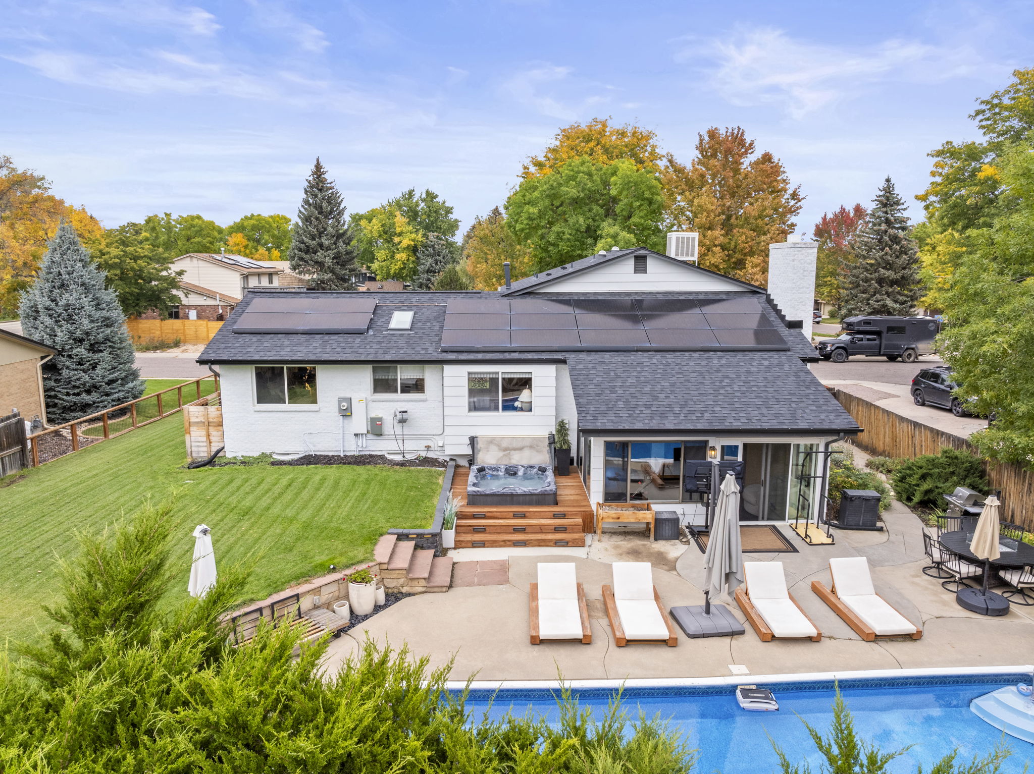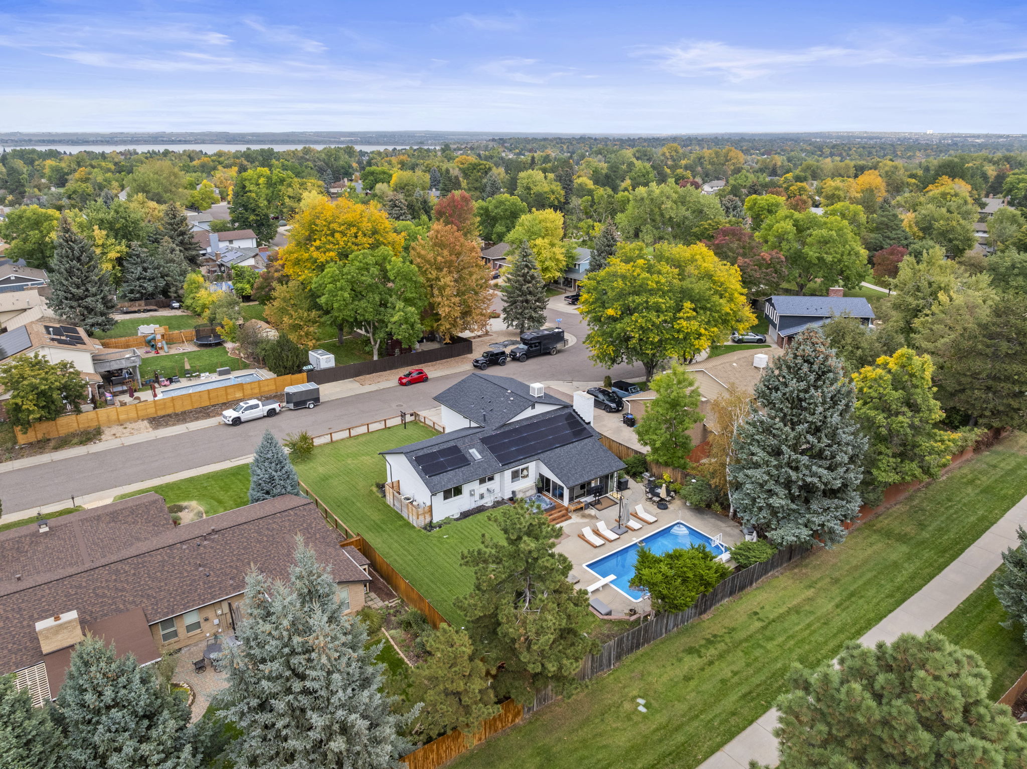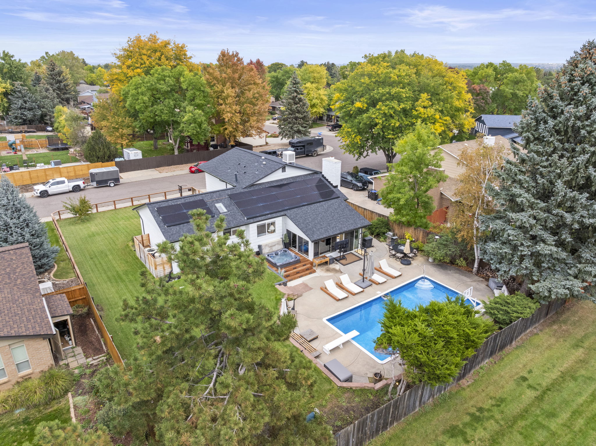 This stunning home sits on a spacious .23-acre lot and offers your own private oasis with a heated in-ground pool, hot tub, fully paid solar panels. Inside, you’ll find soaring ceilings, an open floor plan, and abundant natural light. The kitchen features a skylight, plenty of cabinetry, and an eat-in area that opens to the family room. Family room with a grand fireplace and gorgeous wet bar ideal for gatherings. A formal dining room or piano room sits just off the kitchen, while the front room offers flexibility as a large dining area or elegant formal living space. The primary suite is generously sized, featuring a spa-inspired bathroom with a luxury shower complete with body sprays and hand wand, double vanity with lighted mirrors, and a large custom closet with built-ins . A secondary bedroom with a full hall bath completes this level, with new flooring continuing throughout this level. The newly finished lower level adds exceptional living space with two non-conforming bedrooms, a recreation room, and a classy full bath with soaking tub. The laundry room completes this level. Now let’s talk about this backyard! The heated sunroom overlooks an entertainer’s paradise, where the completely renovated yard provides ample space. Enjoy the beautiful in-ground pool with diving board and hot tub, surrounded by lush landscaping and all-new improvements. Nearly everything has been updated, including a new pool pump, industrial-grade pool plumbing, heat pump, gas heater, smart pool system with water thermostat, oversized filter, electrical disconnects and grounding lines. New concrete pad for the hot tub, new fencing, , and a smart sprinkler controller.Energy efficiency abounds with 2 220 outlets perfect for electric vehicles in 2 car garage. Just steps away from the trail to Standley Lake, you can easily walk, bike, or enjoy breathtaking Colorado sunsets over the water. This home truly has it all—luxury, comfort, energy efficiency, and an unbeatable location.