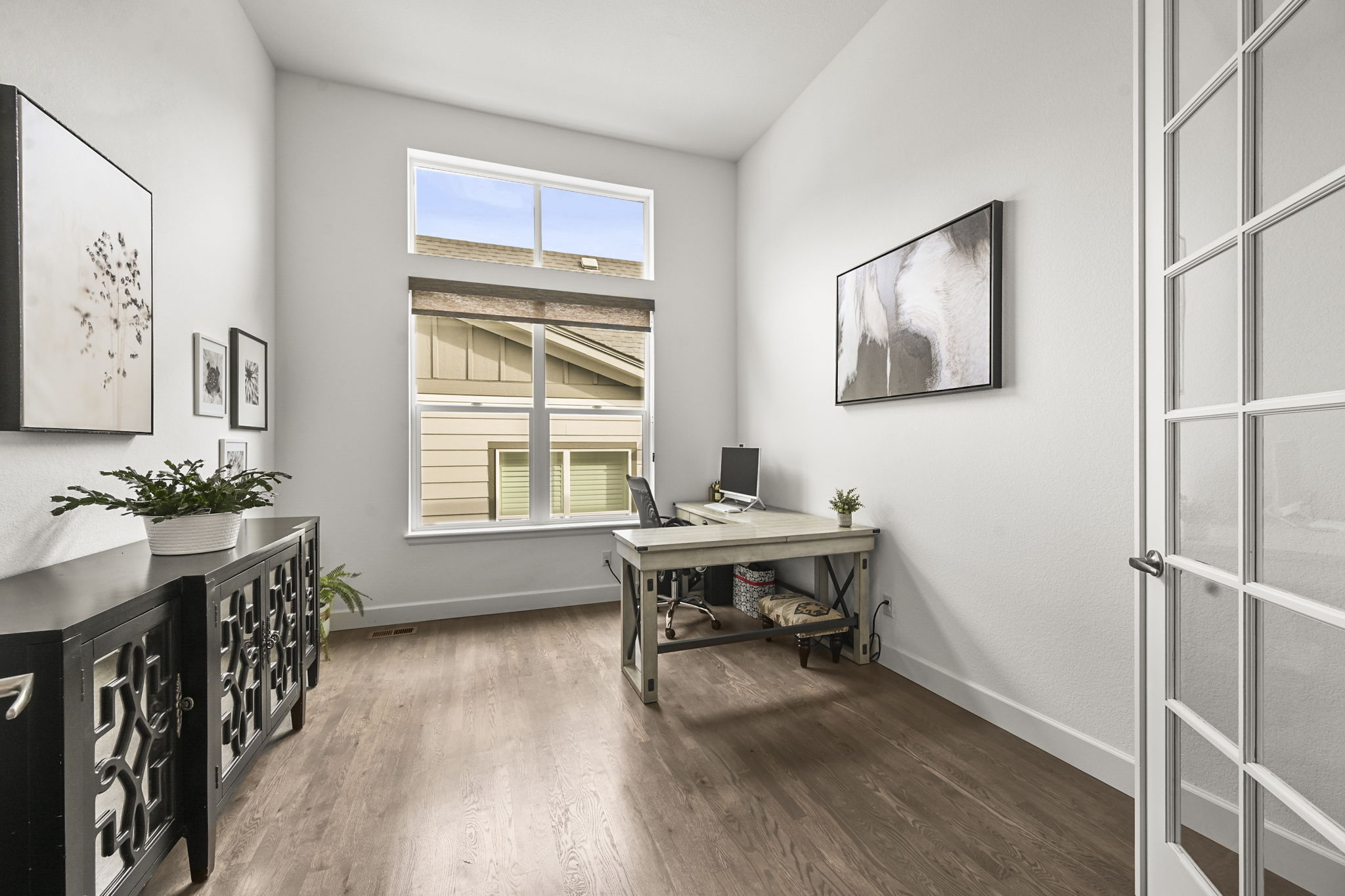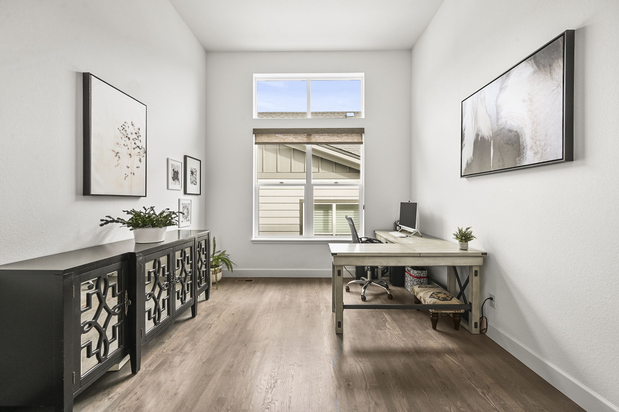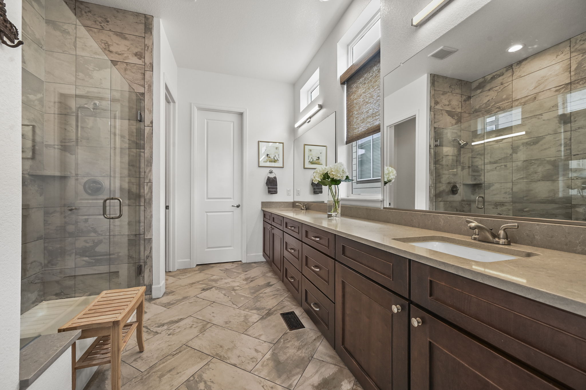 The main floor includes a spacious primary suite with beautiful mountain views. An arched entry leads into the primary bath, featuring a large, beautifully tiled shower, double vanity, and upper windows that bring in wonderful natural light. A secondary bedroom and full bath on the main level are perfect for guests, and the dedicated main floor office offers great flexibility for working from home.