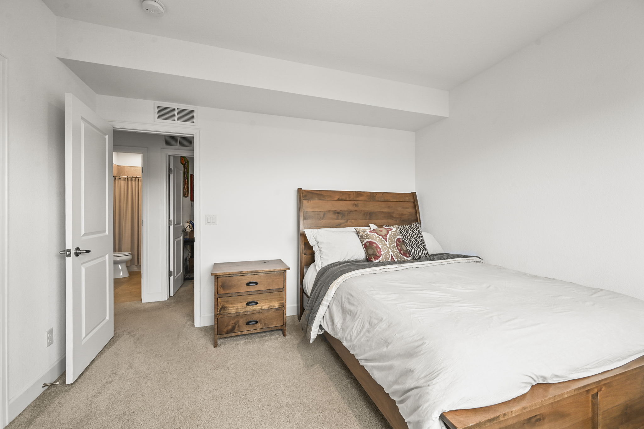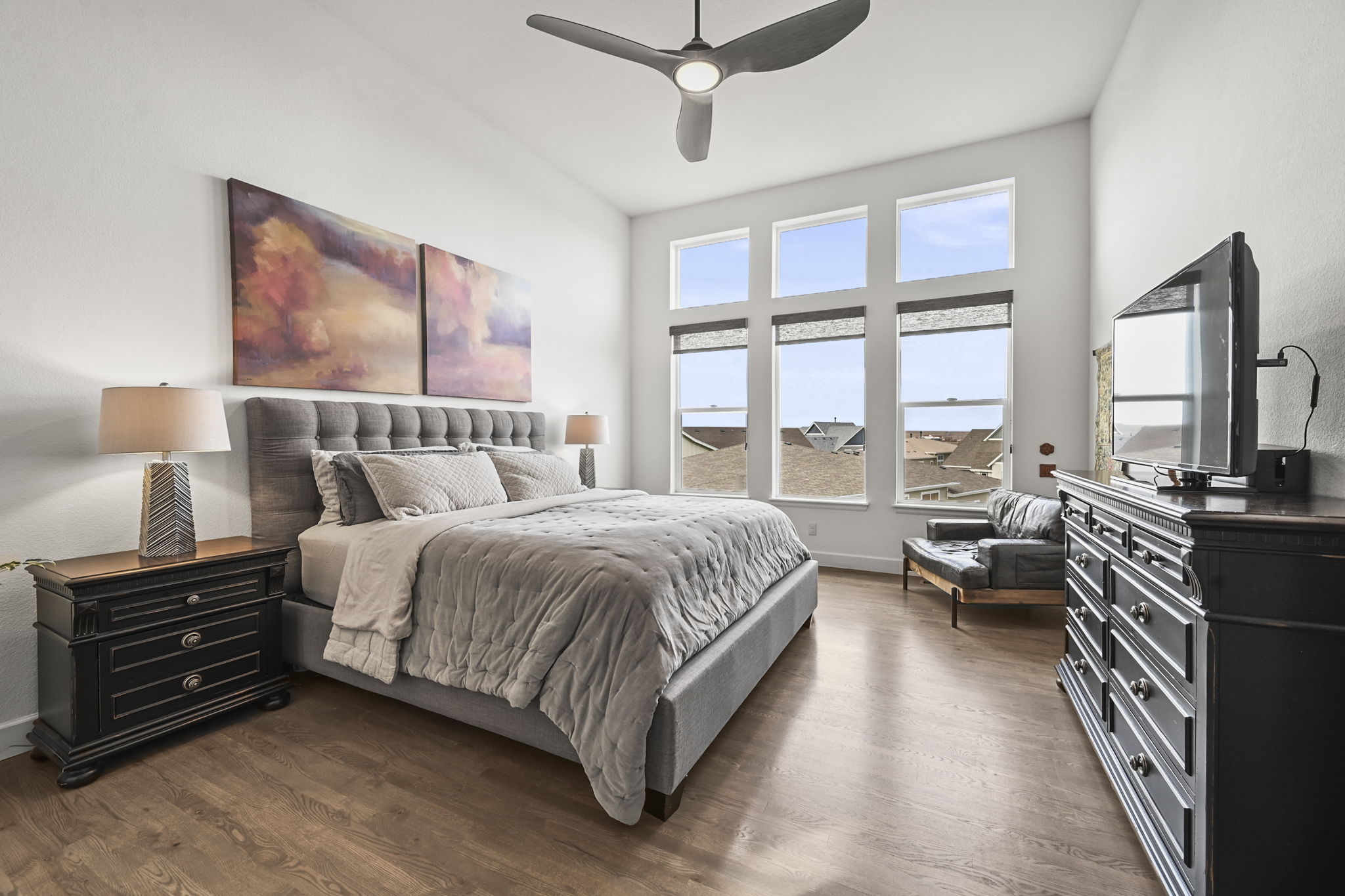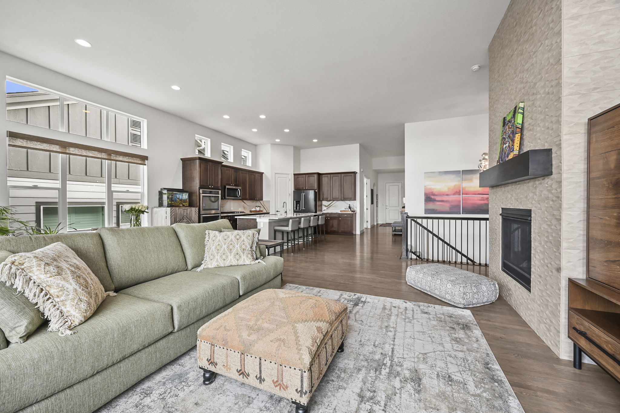 The main floor includes a spacious primary suite with beautiful mountain views. An arched entry leads into the primary bath, featuring a large, beautifully tiled shower, double vanity, and upper windows that bring in wonderful natural light. A secondary bedroom and full bath on the main level are perfect for guests, and the dedicated main floor office offers great flexibility for working from home.