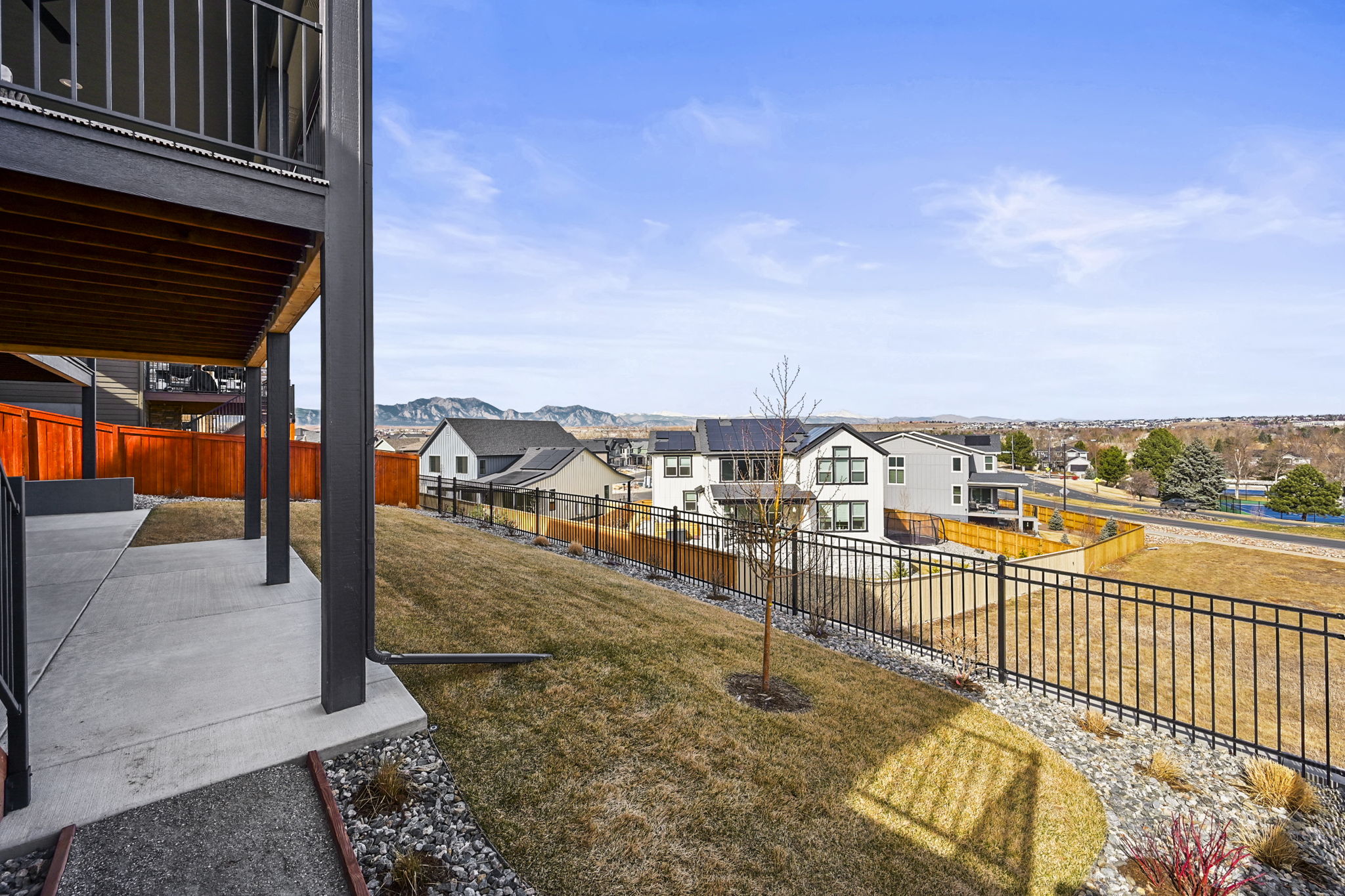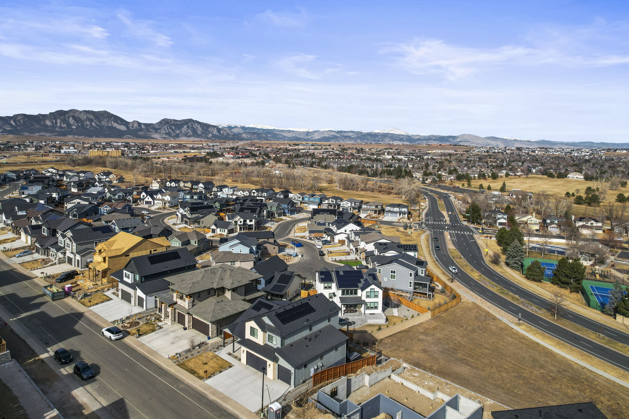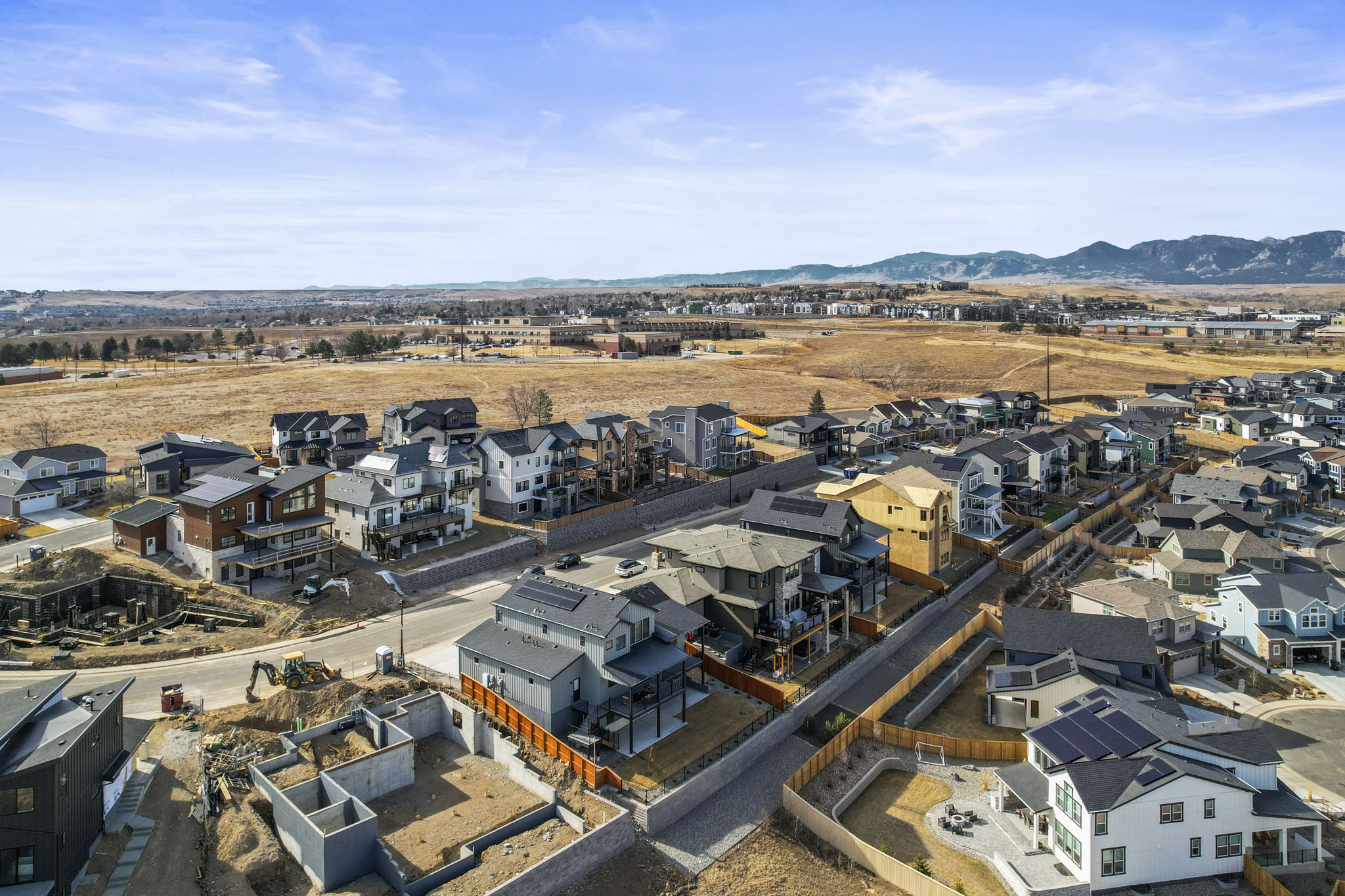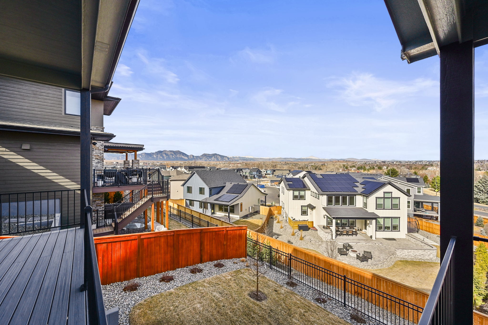 Wake up to Foothills and Flatirons views from all three levels in this exceptional luxury home where thoughtful design, sustainability, and the Colorado lifestyle come together. The main level welcomes you with a bright living room, where expansive windows flood the space with natural light and frame sweeping mountain vistas. White oak flooring spans the level, complemented by designer lighting, custom blinds, and a striking gas fireplace. Eco-conscious features include owned solar panels with a microgrid system for backup power, high-efficiency HVAC, R23 insulation, an instant hot water heater, and a fresh-air HRV system. At the heart of the home is the gourmet kitchen with high-end appliances including a built-in Sub-Zero refrigerator, 42-inch custom cabinetry, a walk-in pantry, and a spacious center island. Entertaining flows seamlessly onto the oversized deck with breathtaking views. Just off the main living space is a private office with french doors, a half bath, and a mudroom connecting to the oversized 4-car garage. The upper level features a stunning primary suite with incredible views, dual closets, and a luxurious five-piece bath, plus direct access to the laundry room. Two additional bedrooms and a full hall bath complete this level. The walk-out basement is filled with natural light and features a spacious family room perfect for movie nights, game days, or multi-generational living. This level also includes two additional bedrooms, a full bath, and extra laundry hookups, offering flexible living options. Outside, enjoy a landscaped and fenced backyard with grassy areas, a large deck, and a patio perfect for outdoor living. Residents also enjoy access to community amenities including an outdoor pool, clubhouse, tennis courts, and scenic community trails.