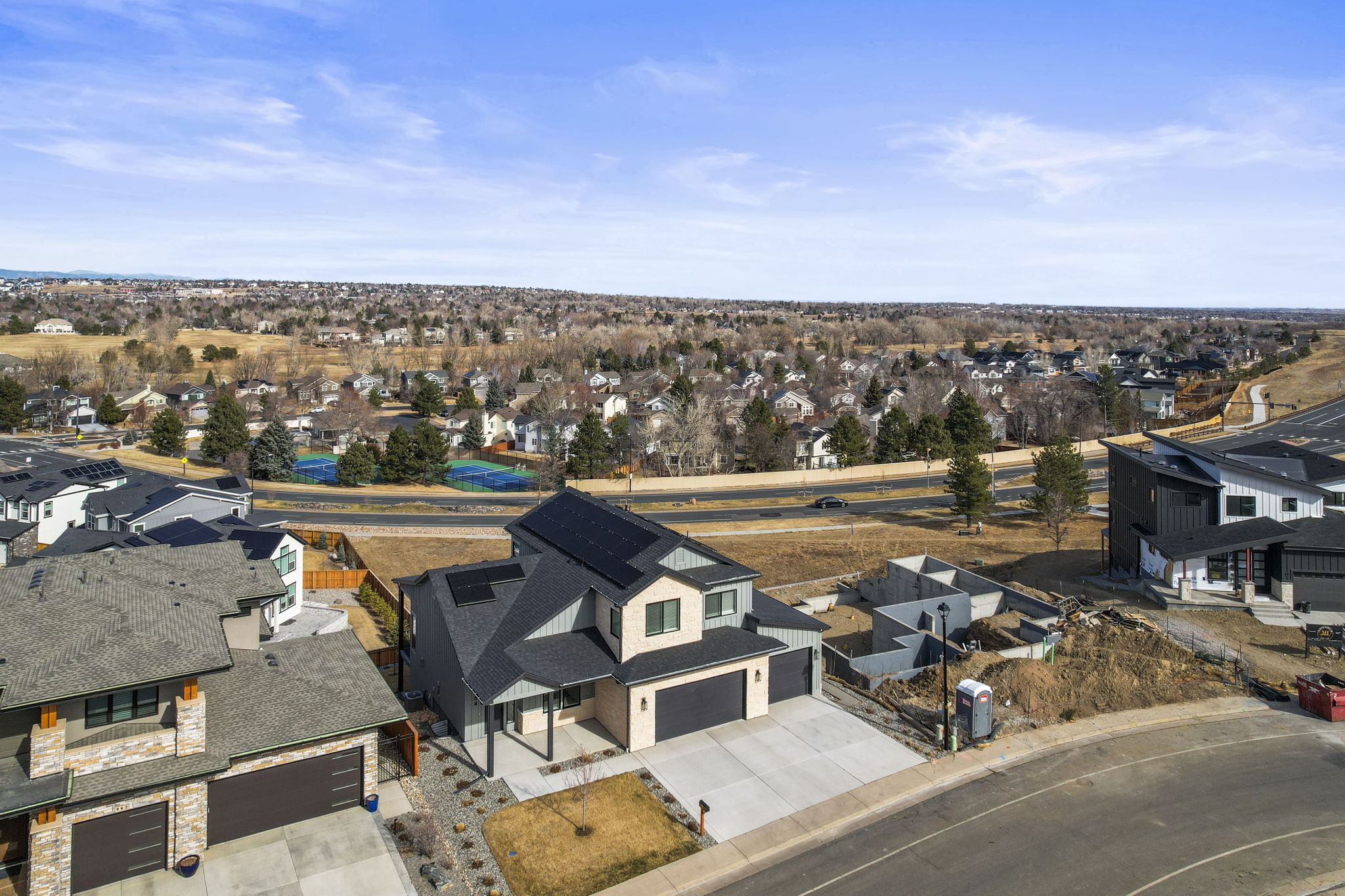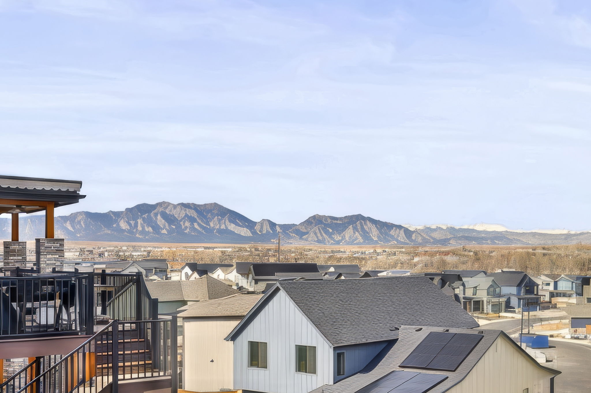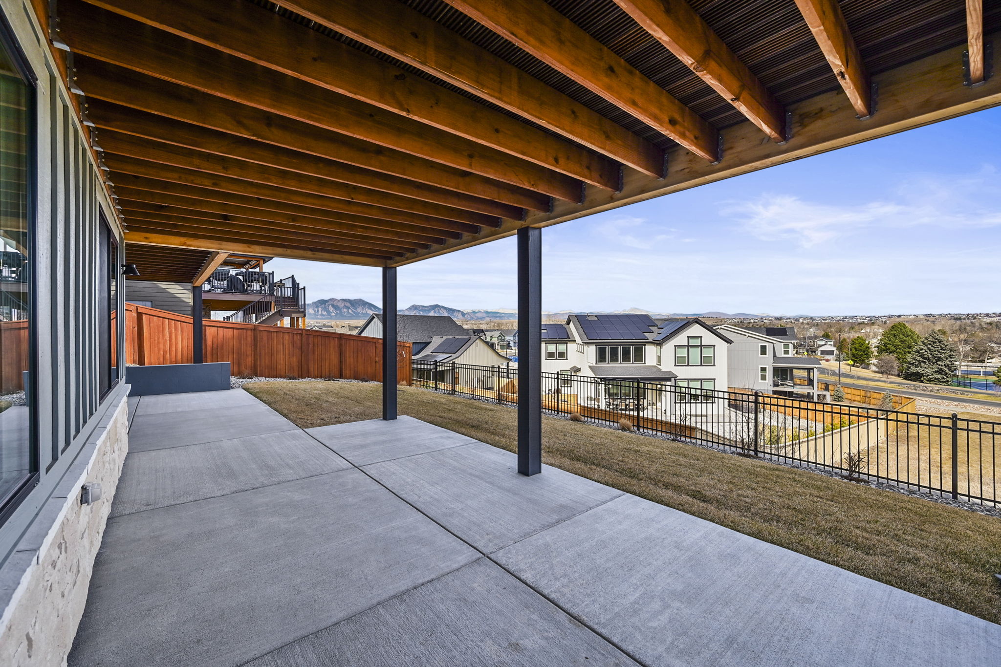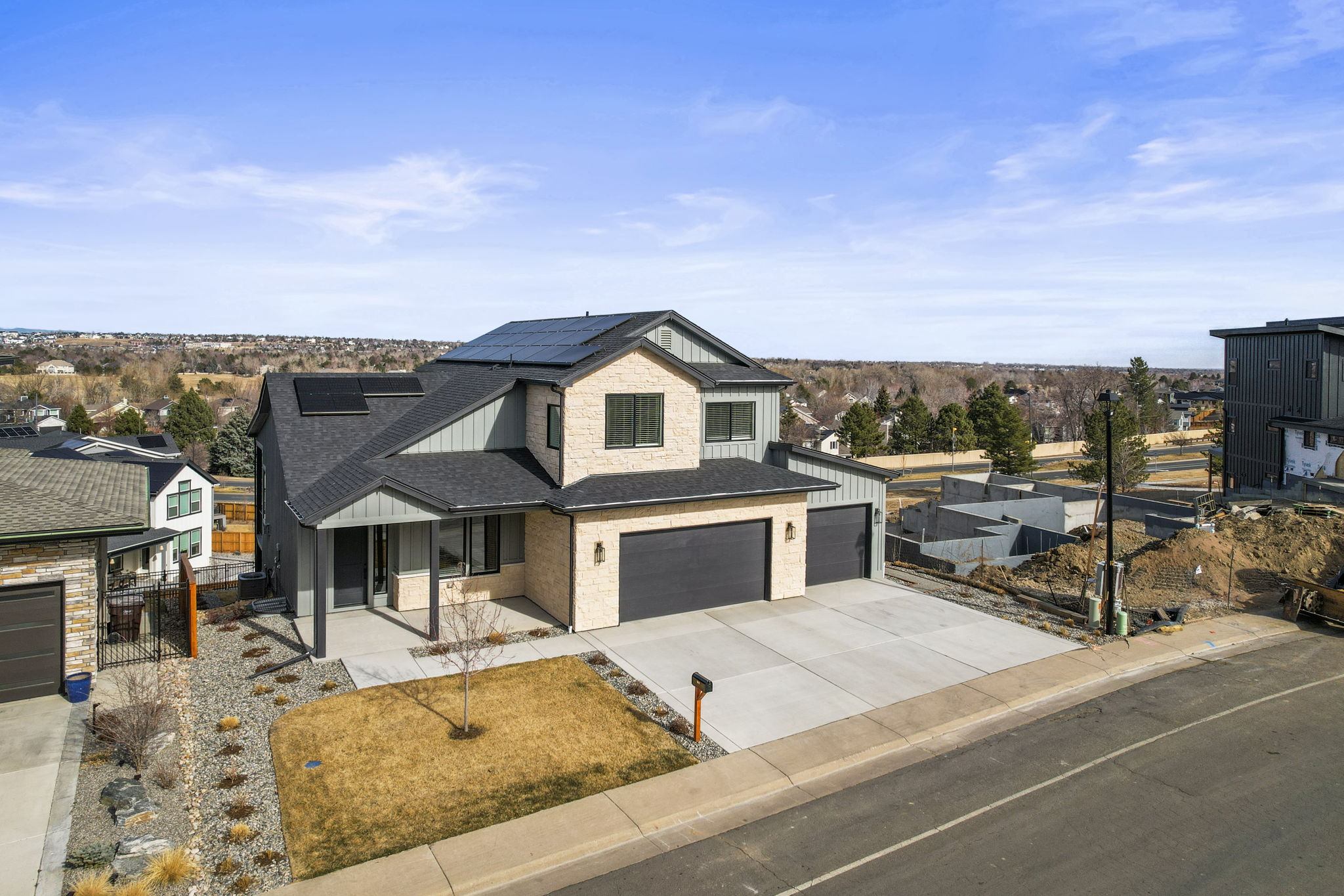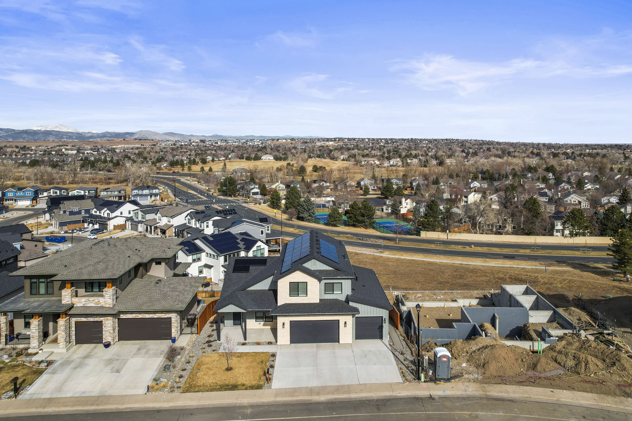 Wake up to Foothills and Flatirons views from all three levels in this exceptional luxury home where thoughtful design, sustainability, and the Colorado lifestyle come together. The main level welcomes you with a bright living room, where expansive windows flood the space with natural light and frame sweeping mountain vistas. White oak flooring spans the level, complemented by designer lighting, custom blinds, and a striking gas fireplace. Eco-conscious features include owned solar panels with a microgrid system for backup power, high-efficiency HVAC, R23 insulation, an instant hot water heater, and a fresh-air HRV system. At the heart of the home is the gourmet kitchen with high-end appliances including a built-in Sub-Zero refrigerator, 42-inch custom cabinetry, a walk-in pantry, and a spacious center island. Entertaining flows seamlessly onto the oversized deck with breathtaking views. Just off the main living space is a private office with french doors, a half bath, and a mudroom connecting to the oversized 4-car garage. The upper level features a stunning primary suite with incredible views, dual closets, and a luxurious five-piece bath, plus direct access to the laundry room. Two additional bedrooms and a full hall bath complete this level. The walk-out basement is filled with natural light and features a spacious family room perfect for movie nights, game days, or multi-generational living. This level also includes two additional bedrooms, a full bath, and extra laundry hookups, offering flexible living options. Outside, enjoy a landscaped and fenced backyard with grassy areas, a large deck, and a patio perfect for outdoor living. Residents also enjoy access to community amenities including an outdoor pool, clubhouse, tennis courts, and scenic community trails.