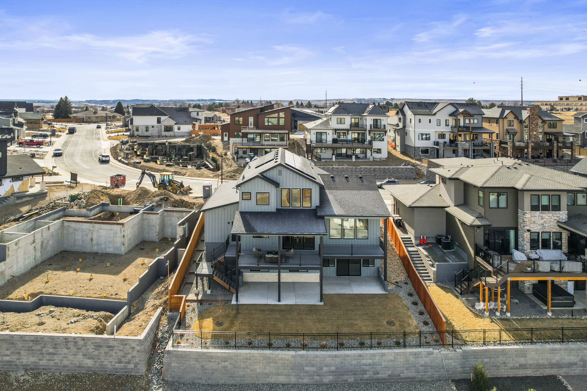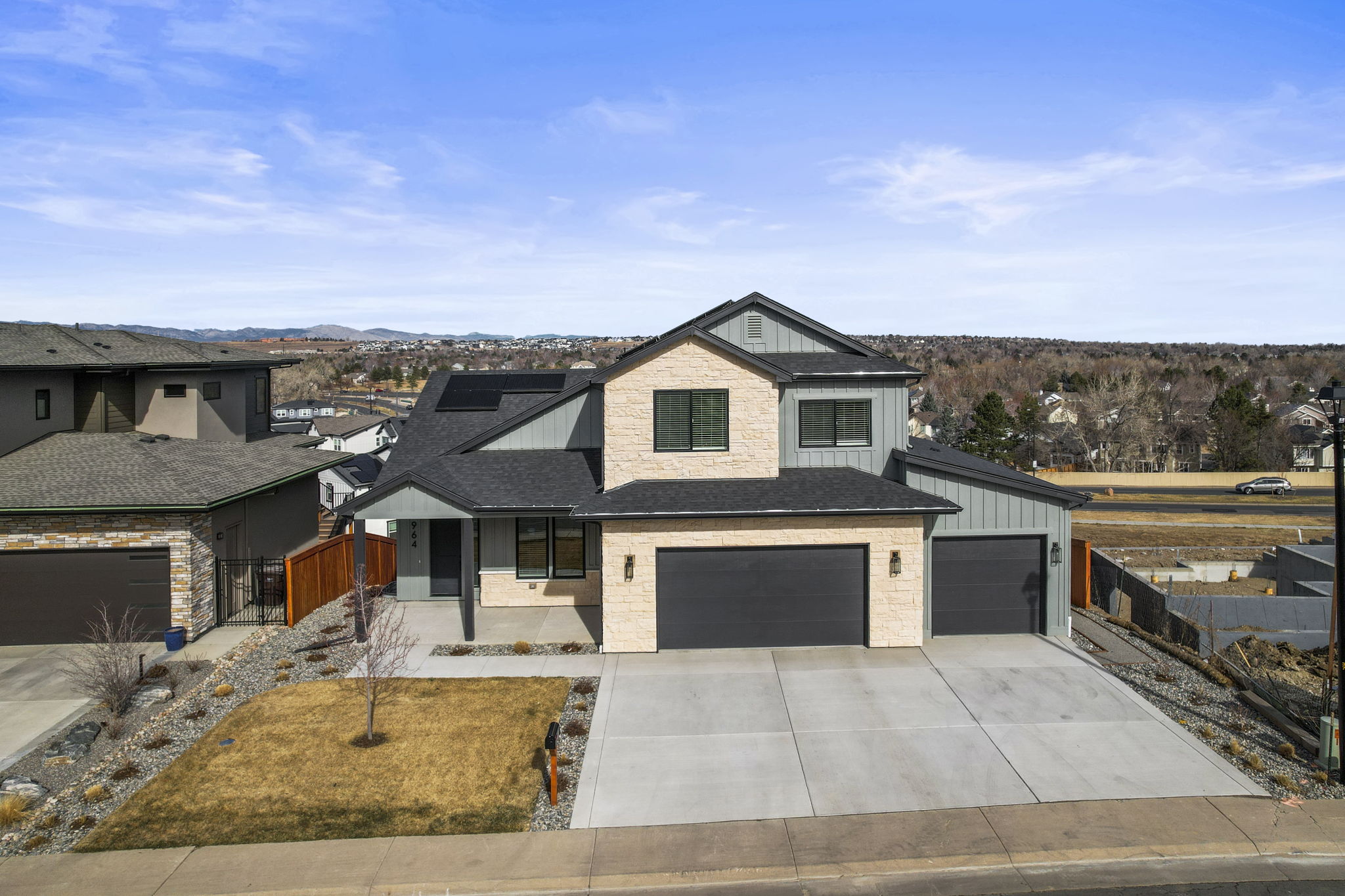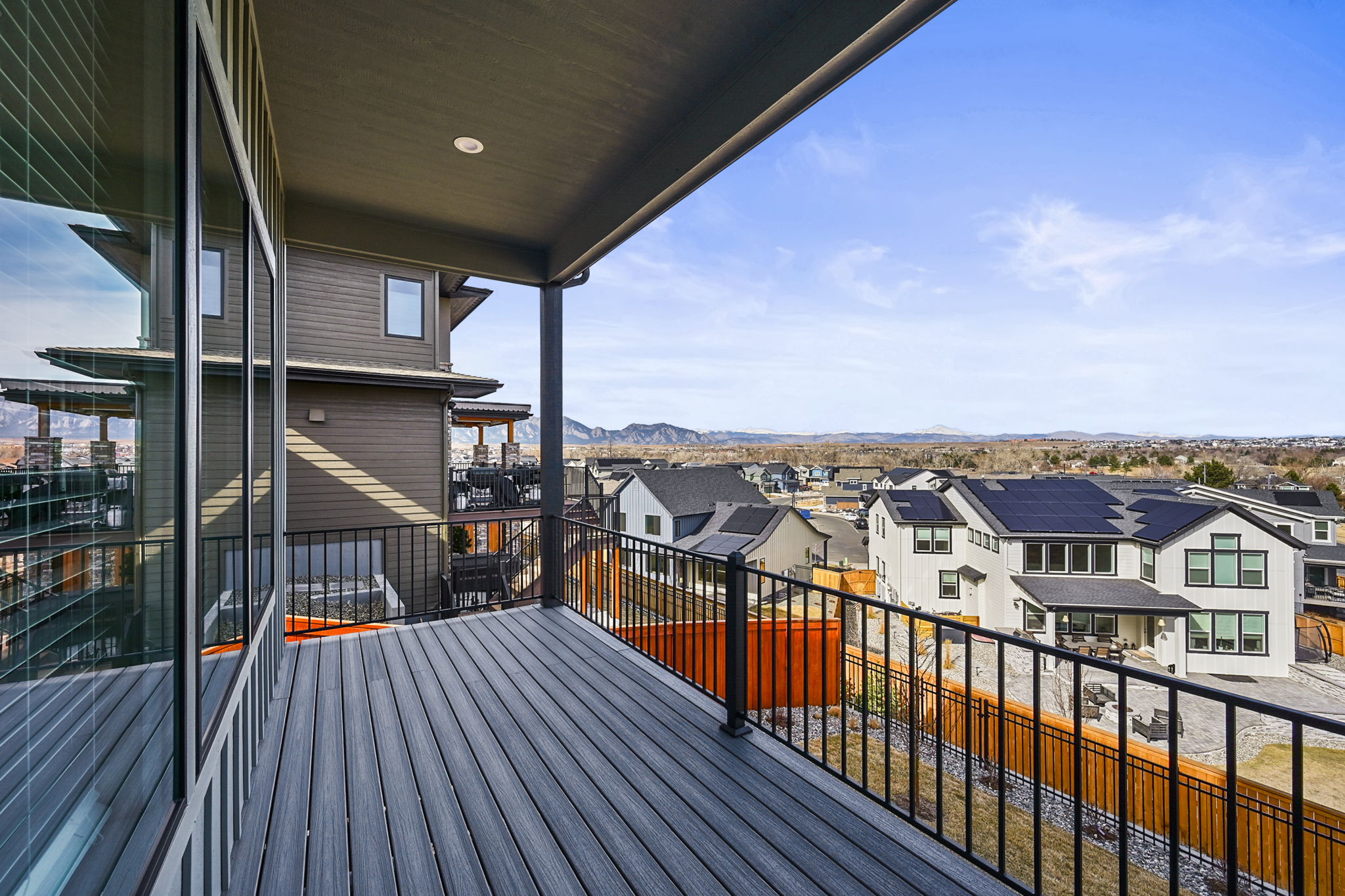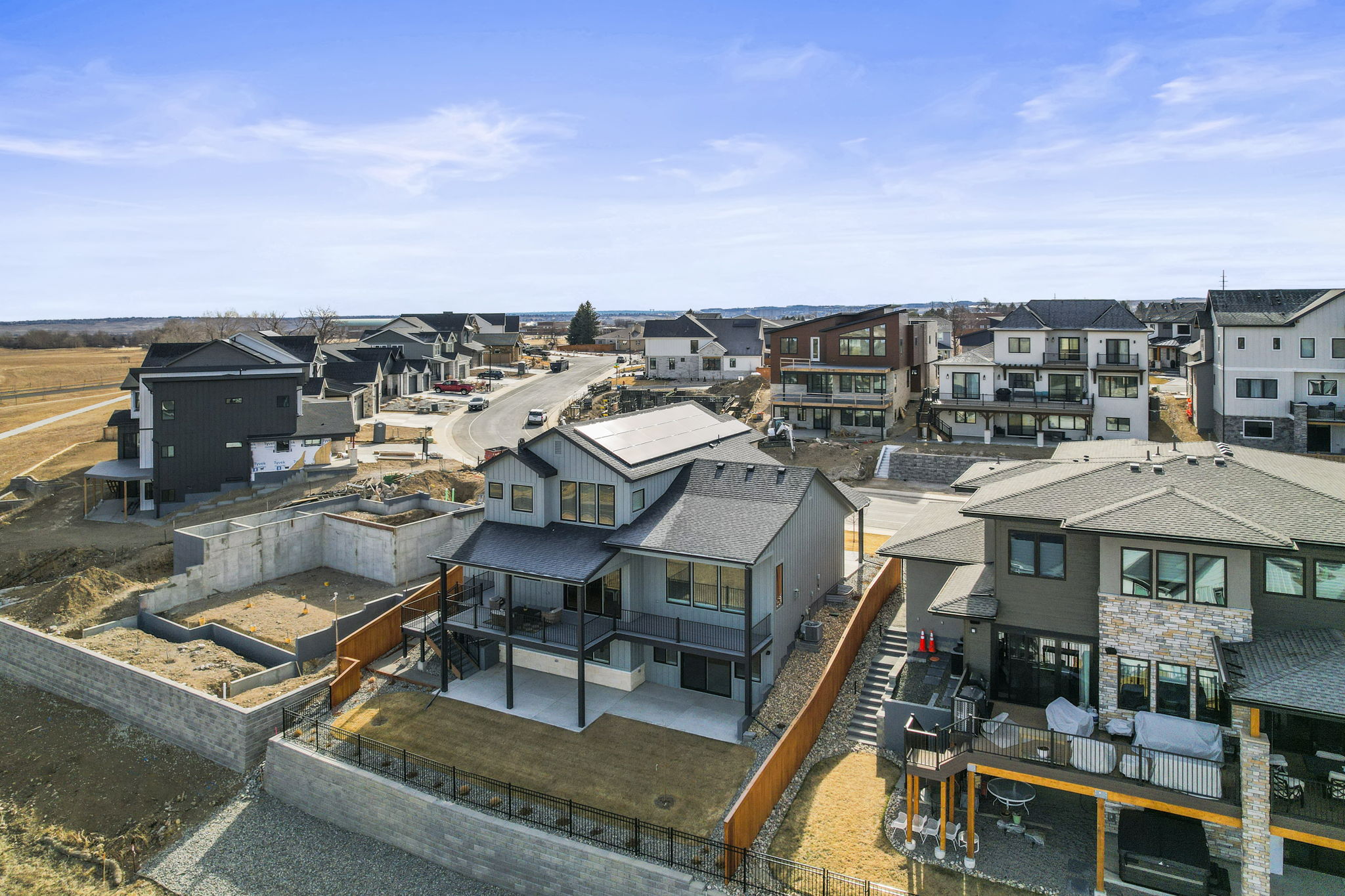 Wake up to Foothills and Flatirons views from all three levels in this exceptional luxury home where thoughtful design, sustainability, and the Colorado lifestyle come together. The main level welcomes you with a bright living room, where expansive windows flood the space with natural light and frame sweeping mountain vistas. White oak flooring spans the level, complemented by designer lighting, custom blinds, and a striking gas fireplace. Eco-conscious features include owned solar panels with a microgrid system for backup power, high-efficiency HVAC, R23 insulation, an instant hot water heater, and a fresh-air HRV system. At the heart of the home is the gourmet kitchen with high-end appliances including a built-in Sub-Zero refrigerator, 42-inch custom cabinetry, a walk-in pantry, and a spacious center island. Entertaining flows seamlessly onto the oversized deck with breathtaking views. Just off the main living space is a private office with french doors, a half bath, and a mudroom connecting to the oversized 4-car garage. The upper level features a stunning primary suite with incredible views, dual closets, and a luxurious five-piece bath, plus direct access to the laundry room. Two additional bedrooms and a full hall bath complete this level. The walk-out basement is filled with natural light and features a spacious family room perfect for movie nights, game days, or multi-generational living. This level also includes two additional bedrooms, a full bath, and extra laundry hookups, offering flexible living options. Outside, enjoy a landscaped and fenced backyard with grassy areas, a large deck, and a patio perfect for outdoor living. Residents also enjoy access to community amenities including an outdoor pool, clubhouse, tennis courts, and scenic community trails.